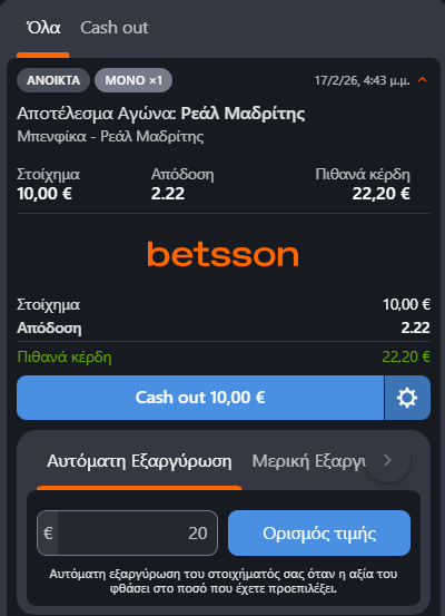 Με αυτές τις δύο λειτουργίες, η Betsson δίνει στον χρήστη τον απόλυτο έλεγχο του δελτίου του, όποια κι αν είναι η εξέλιξη του παιχνιδιού.