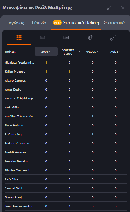 Η στατιστική ανάλυση των παικτών του αγώνα είναι διαθέσιμη στα κορυφαία αθλητικά γεγονότα. Η λειτουργία παρέχεται σε live περιβάλλον και δίνει ξεκάθαρη εικόνα για τα σουτ, τα σουτ στον στόχο, τα φάουλ καθώς και τις ασίστ κάθε παίκτη, ανά πάσα στιγμή.